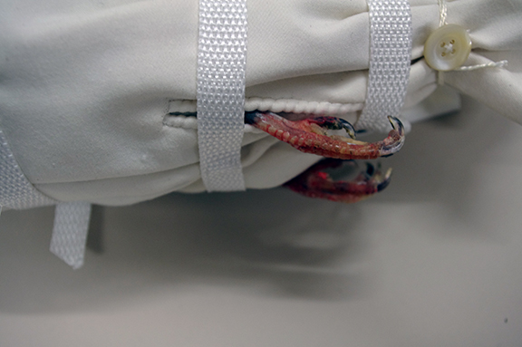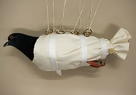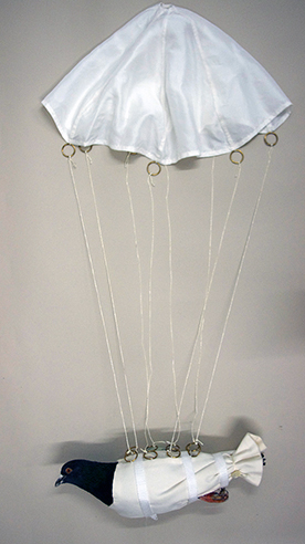 Rekonstruktion einer gepolsterten Halterung für eine Kuriertaube aus dem 2. Weltkrieg nebst dazugehörigem Fallschirm, Spymuseum Berlin, 2014 |