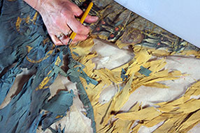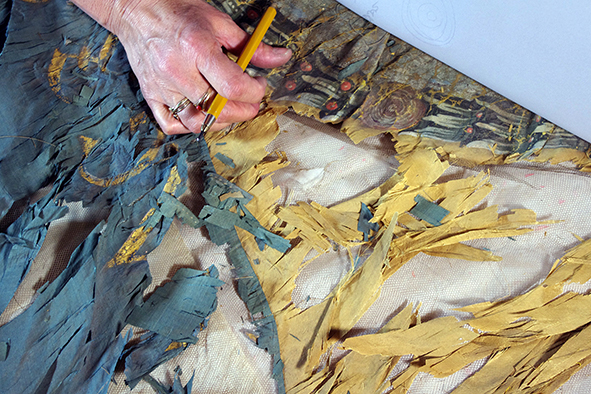 Bei einem gemeinsamen Ortstermin in den Plauener Werkstätten wurden die Zeichnungen begutachtet, kontrolliert, freigegeben und die geeigneten farbigen Seidenstoffe ausgewählt. Die Motive wurden von Hand aufwändig gestickt, appliziert und gemalt.