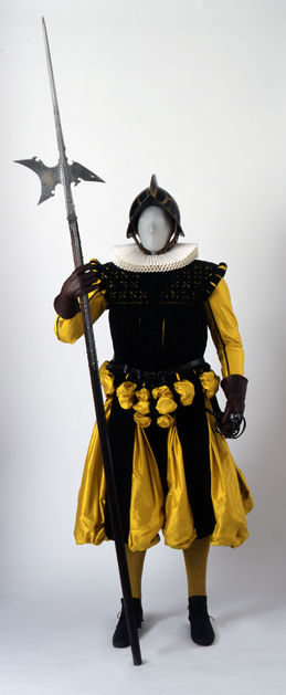 Die Kleidungsstücke - gehacktes Wams, geschlitzte Pluderhosen, Halskrause, Schuhe, Strümpfe und Handschuhe - sind eigens für die Ausstellung angefertigte Rekonstruktionen. Sie orientieren sich an Abbildungen von Leibtrabanten auf Gemälden, kolorierten Zeichnungen und Stichen aus dem späten 16. und frühen 17. Jahrhundert, sowie an den Trabantenfiguren auf einem 1589 datierten Automatenkunststück aus dem Dresdner Grünen Gewölbe.