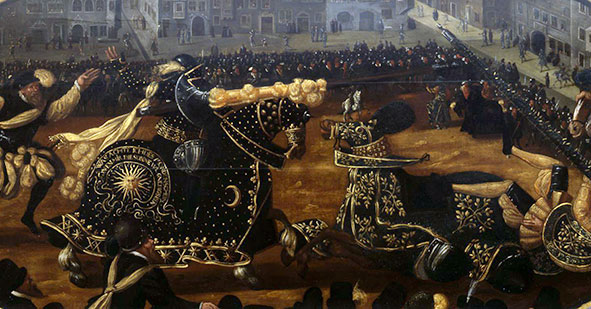 Rennen des Herzog August von Sachsen mit Fabian von Schöneich 1545 in Dresden, Dresden um 1590 (Ausschnitt) RK/SKDHeinrich Göding d.Ä, Foto: © Jürgen Karpinski